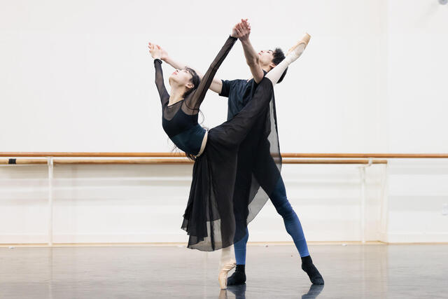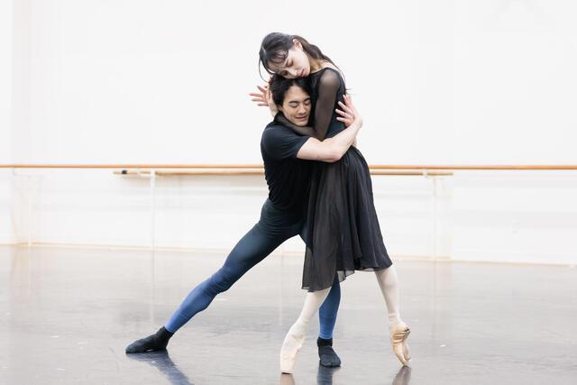 舞踏会で初めて出会い、惹かれ合ったふたりが互いの気持ちを交わすシーンから、バルコニーの場面、ジュリエットの寝室での別れの朝、そして墓場でのラストシーンまで、パ・ド・ドゥを順に踊っていきます。初演キャストの秋山はまさに全身全霊を打ち込むような踊り! 彼女につられるように、初役である大塚の集中力も増し、ふたりの情熱がぶつかり合います。