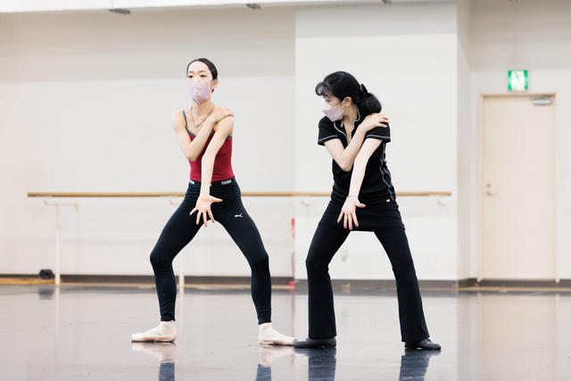 指導にあたるのはバレエ・ミストレスの佐野志織。このパ・ド・ドゥでは、憎み合い、戦う男たちがコール・ド・バレエとして登場しますが、佐野はその指導でも大活躍、彼らの登場により、ベジャールがこの作品にこめた平和への強い思いが浮き彫りになっていきます。