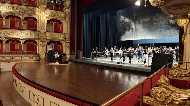 輸送の問題はすべて解決し、翌朝から本格的な仕込みが始まった。ダンサーたちは稽古場から劇場に移動して舞台上でクラスとリハーサルをして翌日の初日に向けて準備を再開した。イタリアの伝統的な劇場の舞台は3%から5%の傾斜があるため、フラットの舞台に慣れているダンサーにとっては微妙な調整が必要なのだろう(ちなみにこの劇場は3%)。