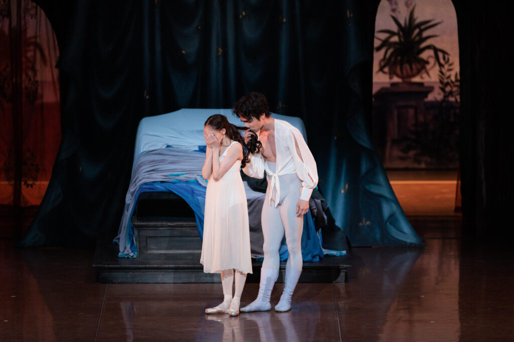 そっと立ち去ろうとするロミオの気配に気付いて目覚めたジュリエットは、「鳴いている鳥は雲雀ではなくナイチンゲール。まだ夜は明けていないわ」とカーテンを引く。そして別れのパ・ド・ドゥ。最後にロミオは後ろからジュリエットの手を取って目隠しをさせ、彼女が目をふさいでいる間に出ていってしまう。その愛おしい髪に、さよならの口づけをして。
