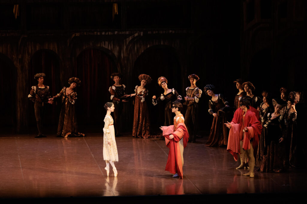 三馬鹿が紛れ込んだ舞踏会で、美女ロザリンドを追いかけていたはずのロミオの視線がいつジュリエットの姿をとらえるのか。その視線にジュリエットはどう気づくのか。ふたりの運命が動き出すこのくだりは、周囲のダンサーたちの細かい演技も見逃せず、じつに目が忙しい。ロミオやジュリエットの表情をオペラグラスでガン見したいけど、そうすると周りが見えないし……そんな葛藤も演劇的バレエを観る醍醐味である。