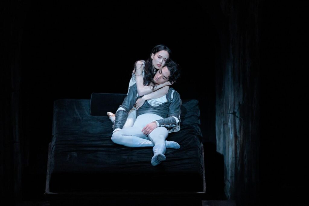 仮死状態のジュリエットが眠る墓所に、ロミオが疾風のように駆け込んでくる。舞台奥に設えられた高い橋の欄干にマントを引っ掛け、それをつたって降りてくるレスキュー隊みたいな侵入の仕方もとてもいい。ひと足先にジュリエットの死を悼んでいたパリスをもはや躊躇うことなく刺し殺すと、抱きしめてももう抱きしめ返してはくれない彼女の亡骸(と思い込んでいる)のそばで、ロミオはあっという間に自刃する。かつてシュツットガルト・バレエ団のフリーデマン・フォーゲルが、「ロミオは5分先の未来しか見ていない」と話してくれたことがある。だとすれば死に急ぐこのスピード感もまた、とてもロミオらしいと言えるだろう。最期の力を振り絞り、ロミオはジュリエットを胸に抱くようにして横たわる。そして彼女の髪を指ですくう。あの、初めての朝のように。